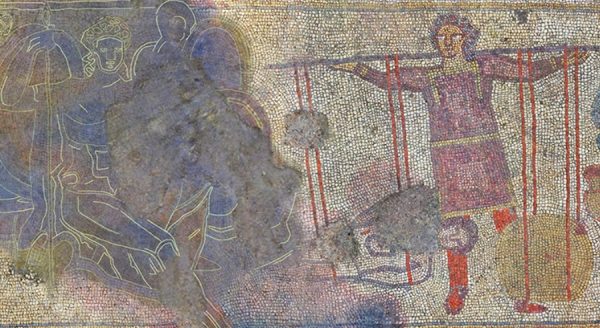 Panel 3 of the mosaic shows Priam, king of Troy, loading a set of scales with gold vessels, to match the weight of his son, Hector. This version of the story is based on the lost play, Phrygians by Aeschylus. Jen Browning from University of Leicester Archaeological Services was able to reconstruct the burnt section by tracing the outline of the tiles. Image Credit – ULAS